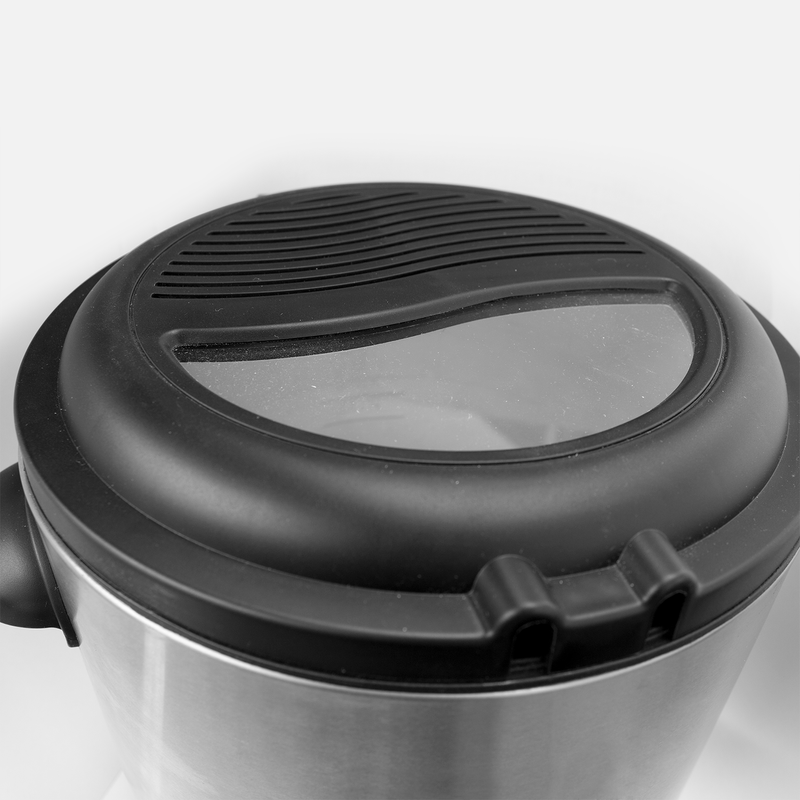 El recipiente para aceite extraíble simplifica el vaciado y mantenimiento, y su tapa con leva de apertura ayuda a evitar salpicaduras. Todo está contenido en una carcasa segura y resistente, con asa de transporte y cable con ficha reforzada.