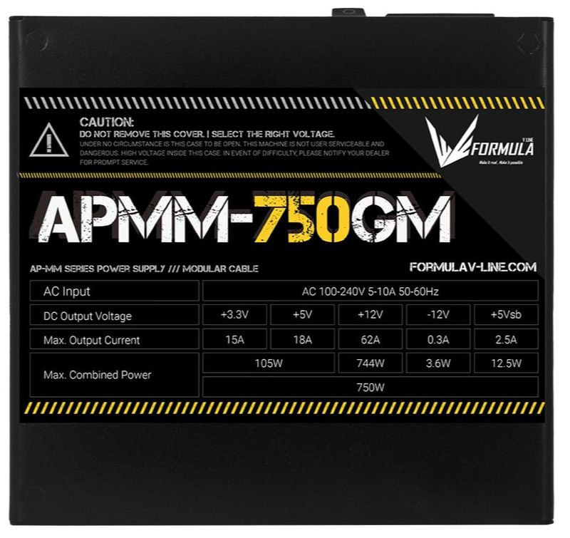 Fuente Formula V Line Apmm-750Gm 750W 80 Plus Gold Full Modular Especificaciones - Modelo: APMM-750gm - Dimension: 150 x 140 x 86mm - Real Watts: 750W - Eficiencia: 80Plus Gold - Input Voltage:230V - Tipo: ATX3.1 / Pcie 5.1 Full modular - Main Capacitor: Japanese Capacitor - Fan: 120mm FDB Conectores / Cables: - Mainboard: 20+4P (600mm) Black flat cable x1 - CPU: P8(4+4) (650mm) Black flat cable x2 - PCI-E: P8(6+2) to P8(6+2) (600mm) Black flat cable x2 - PCIe5.1: PCIe 5.1 H++ 12V-2X6 12VHPWR 16Pin (730mm, 600W) x1 - SATA / IDE: SATA(500mm)+ SATA(150mm)+ SATA(150mm)+ SATA(150mm) Black flat cable x2 - SATA / IDE: IDE(500mm)+ IDE((150mm)+ IDE(150mm)+ IDE(150mm) Black flat cable x1