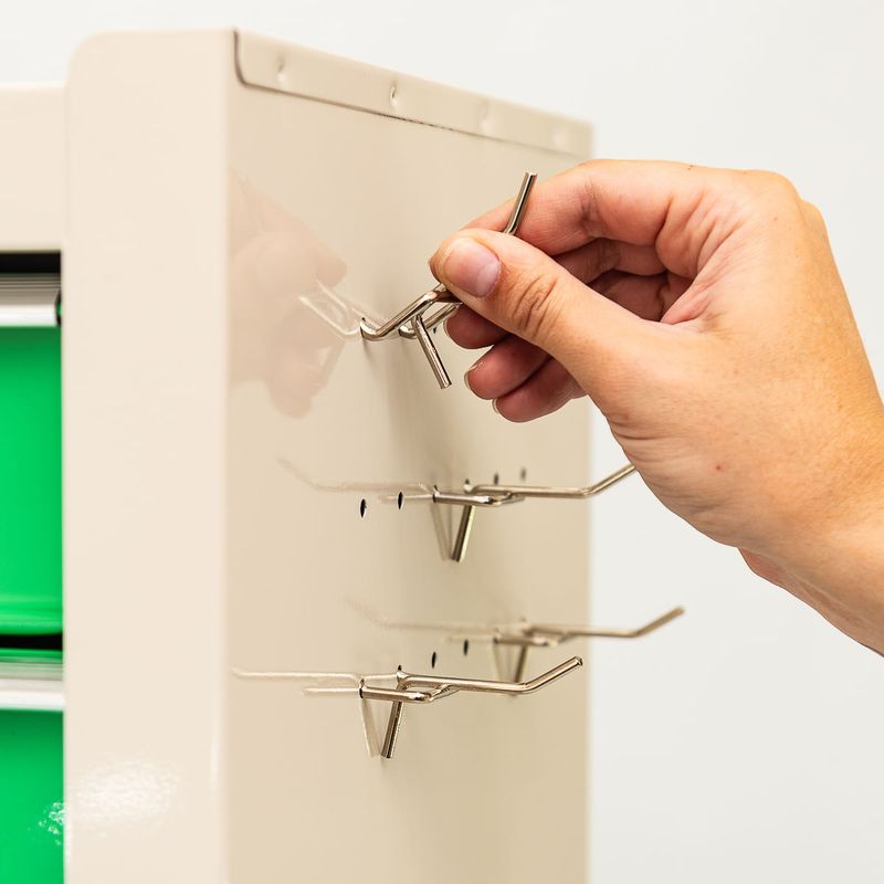 Ojales laterales y 5 ganchos para colgar herramientas (no incluidas).