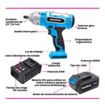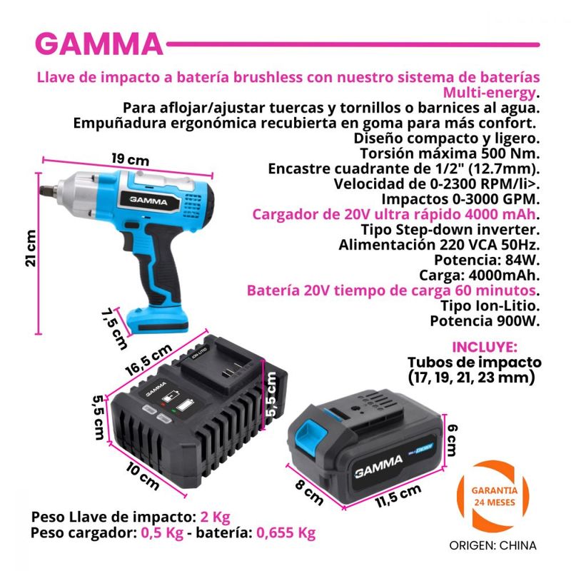 INCLUYE: Cargador y batería 4 mah + tubos de impacto de 17, 19, 21 y 23 mm.