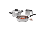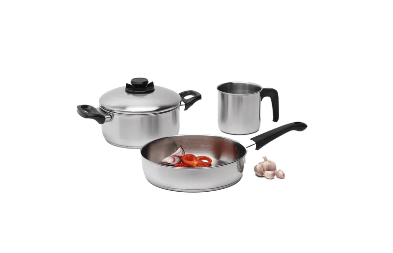 PLATINO SET BASIC: ACERO INOXIDABLE 18/10, CON TRIPLE FONDO SANDWICH, ACCESORIOS DE BAQUELITA CON CUBRELLAMAS, TAPAS CON ESCAPE DE VAPOR, ACABADO EXTERIOR PLATINO 1 CACEROLA DE 20CM 1 SARTÉN 24CM 1 JARRO DE 1,1 LTS Garantia por Falla de Fabrica
