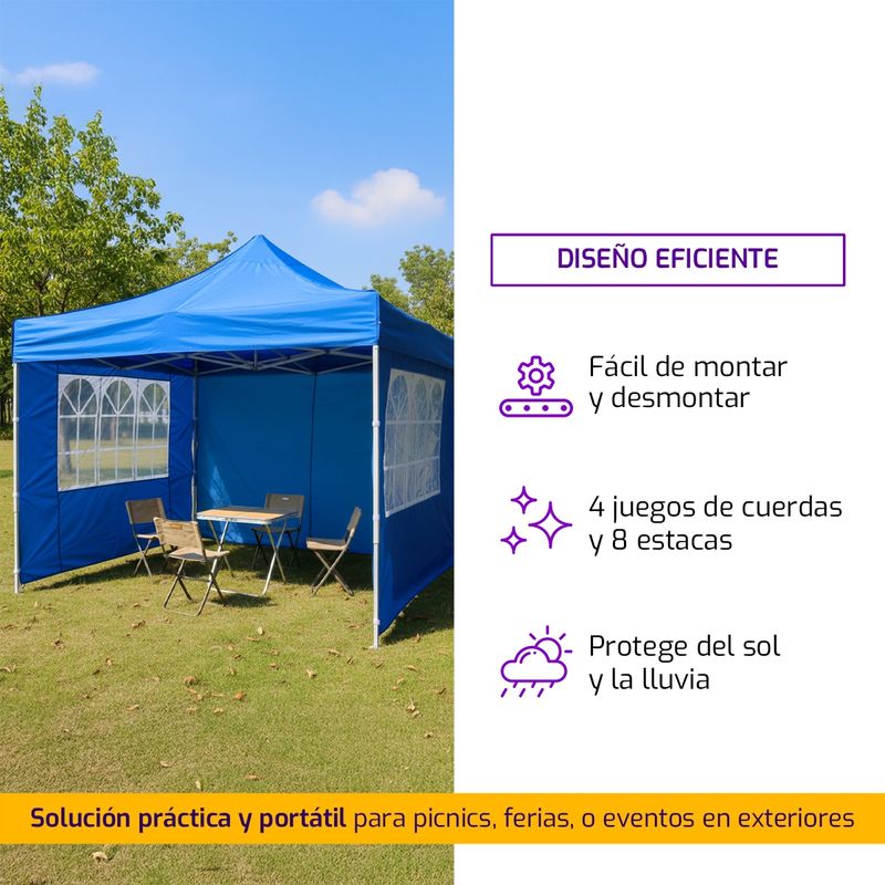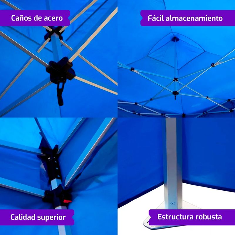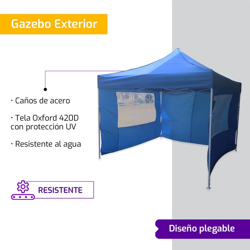 Fabricado con una estructura de postes de acero robustos, brinda estabilidad y durabilidad ante diversas condiciones climáticas. Su cubierta y laterales están confeccionados en tela Oxford, un material resistente al agua y a los rayos UV, ideal para protegerse del sol y la lluvia.