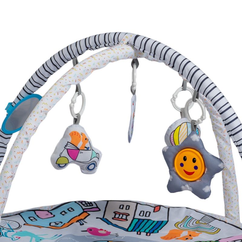 Arcos Interactivos: Equipado con arcos suaves y ajustables que sostienen juguetes colgantes coloridos, cada uno con texturas, sonidos y formas distintas para una experiencia sensorial completa.