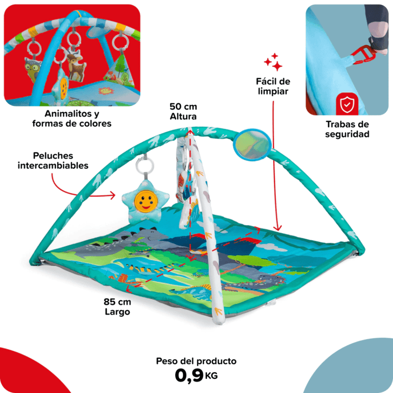 El Gimnasio de Actividades Bebesit 5010 Dino Turquesa transforma cualquier piso en un mundo prehistórico lleno de juego y estimulación. Su suelo acolchado con ilustraciones de dinosaurios, sus arcos suaves y los colgantes interactivos invitan al bebé a explorar texturas, colores y sonidos mientras permanece cómodo y seguro.
