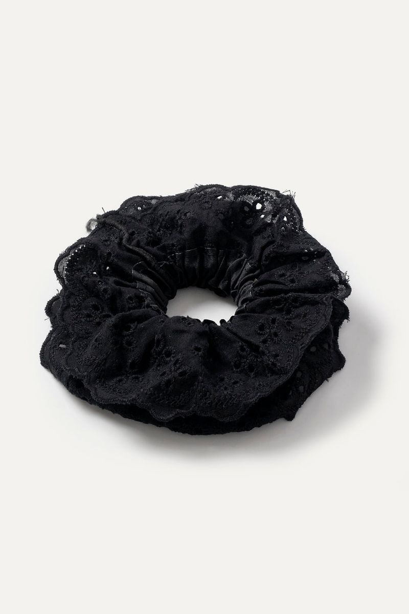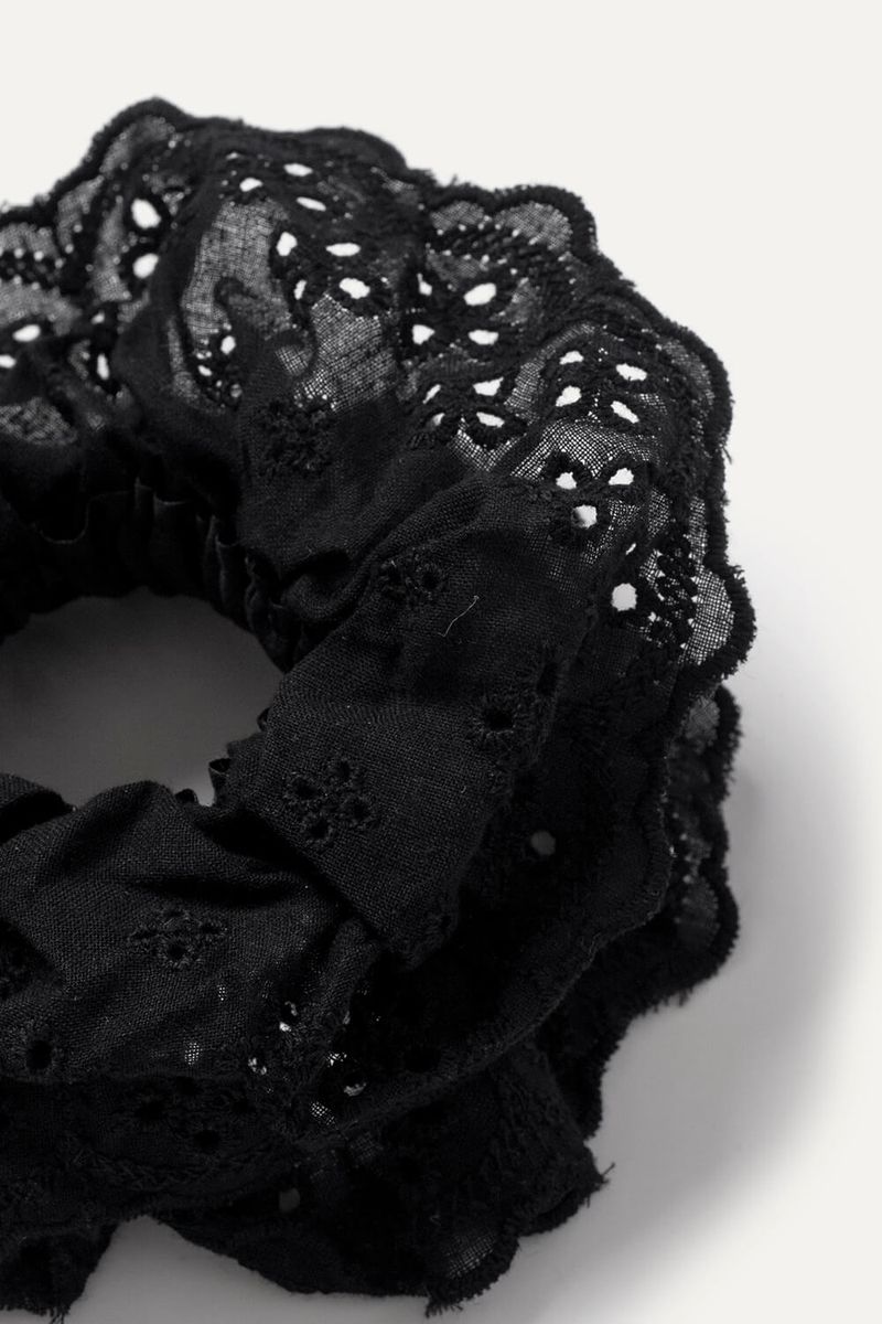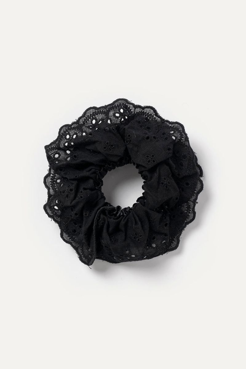 Gomita de pelo estilo scrunchie confeccionada en tela con bordado eyelet, que suma un toque delicado a cualquier peinado. Match sugerido con tops o vestidos de algodón para un look relajado.