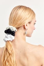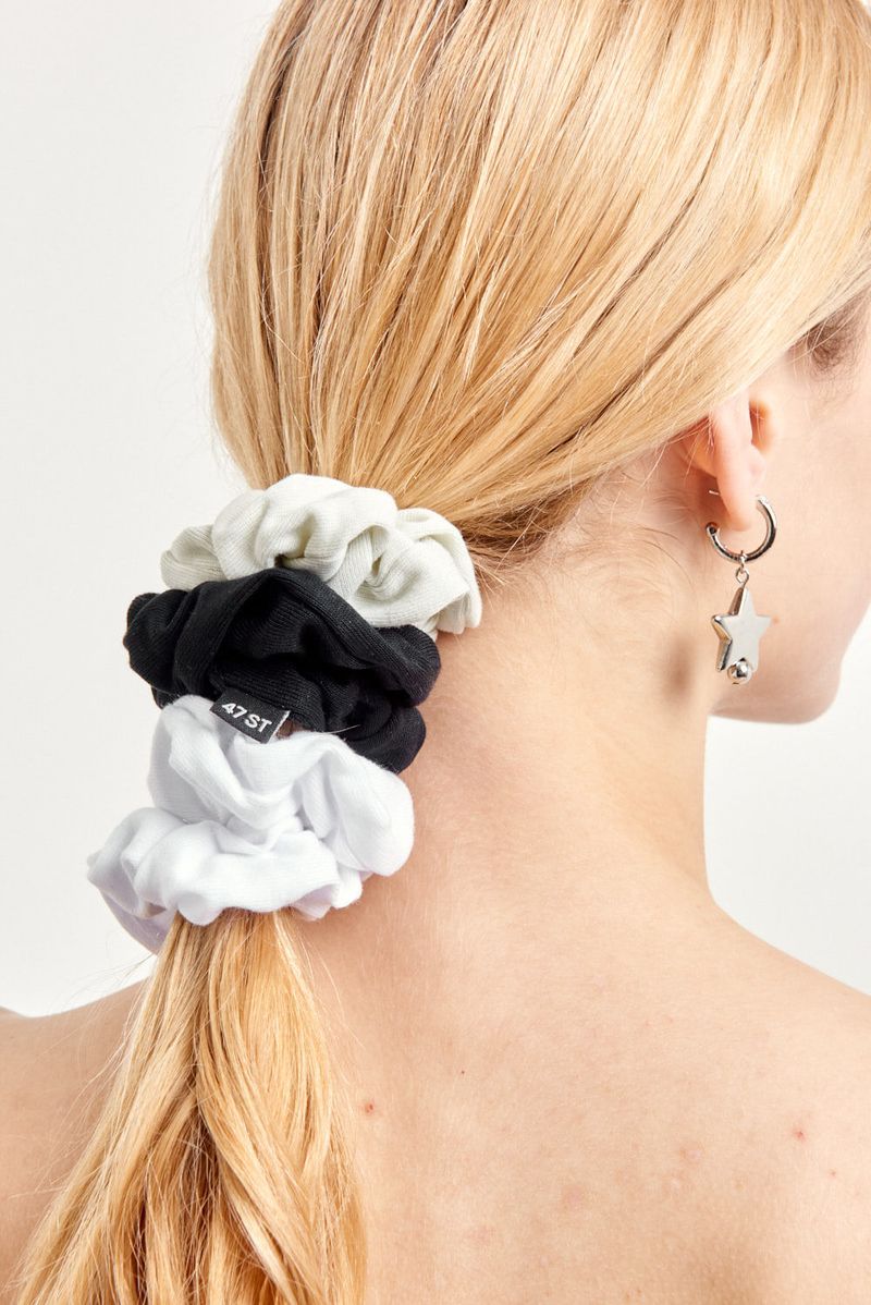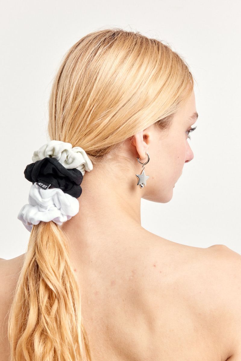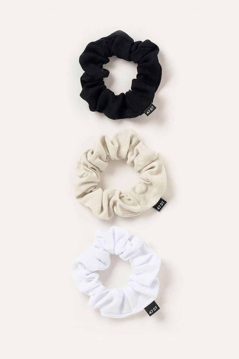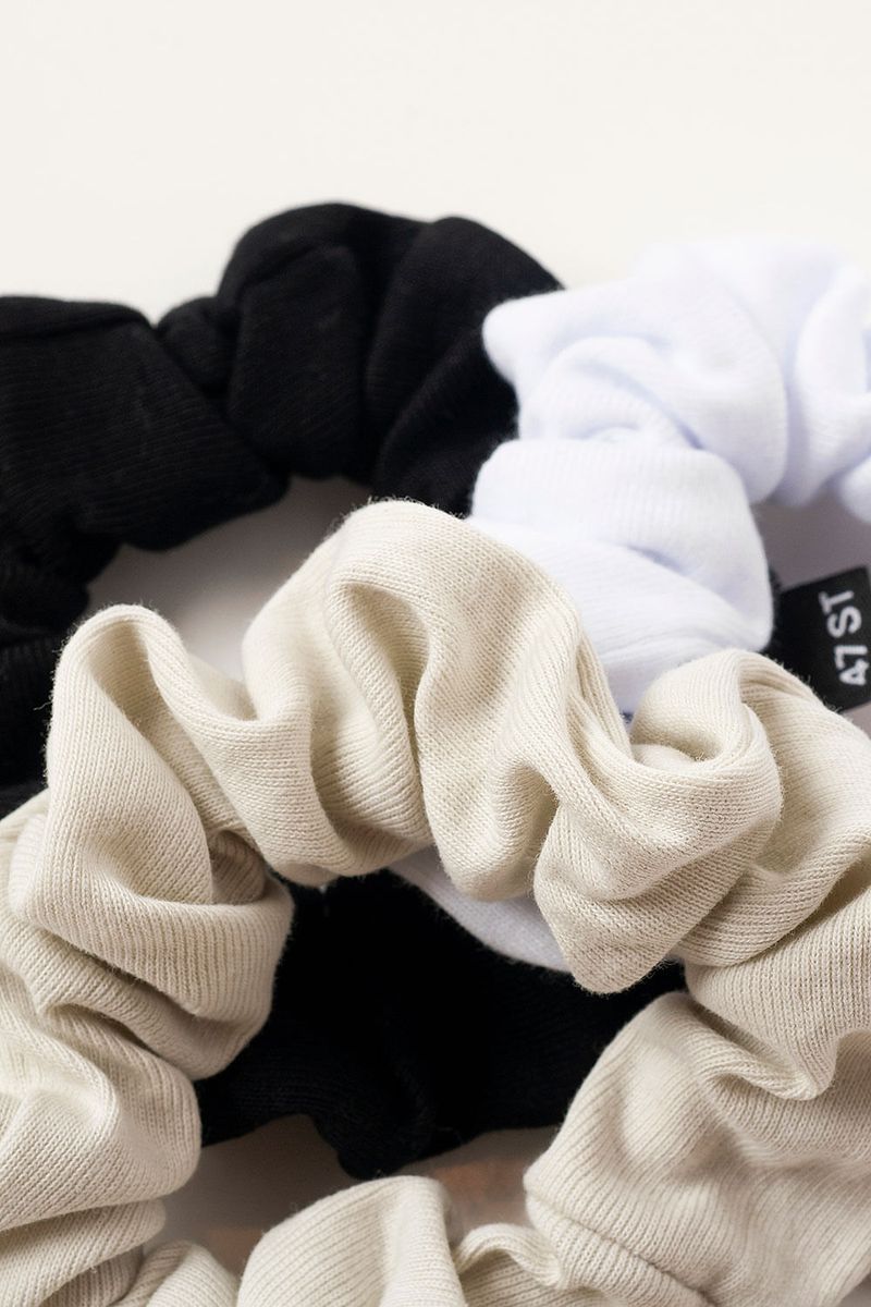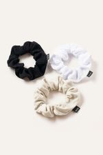 Pack de tres gomitas elásticas con textura suave y colores neutros para usar todos los días. Ideales para recogidos o colas altas con looks relajados.