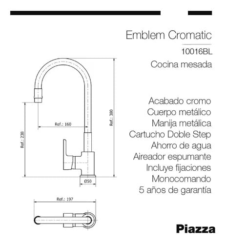 • No esperes más para disfrutar de la funcionalidad y el diseño que este grifo de cocina Piazza Emblem 10016 tiene para ofrecerte.