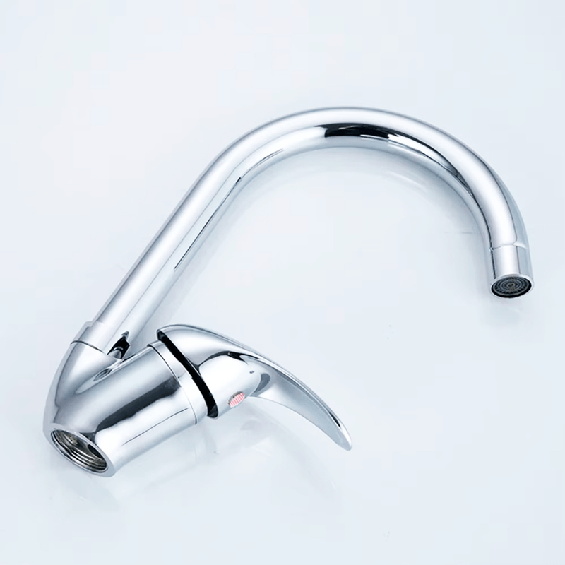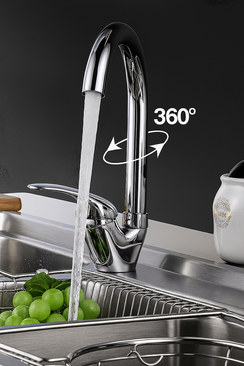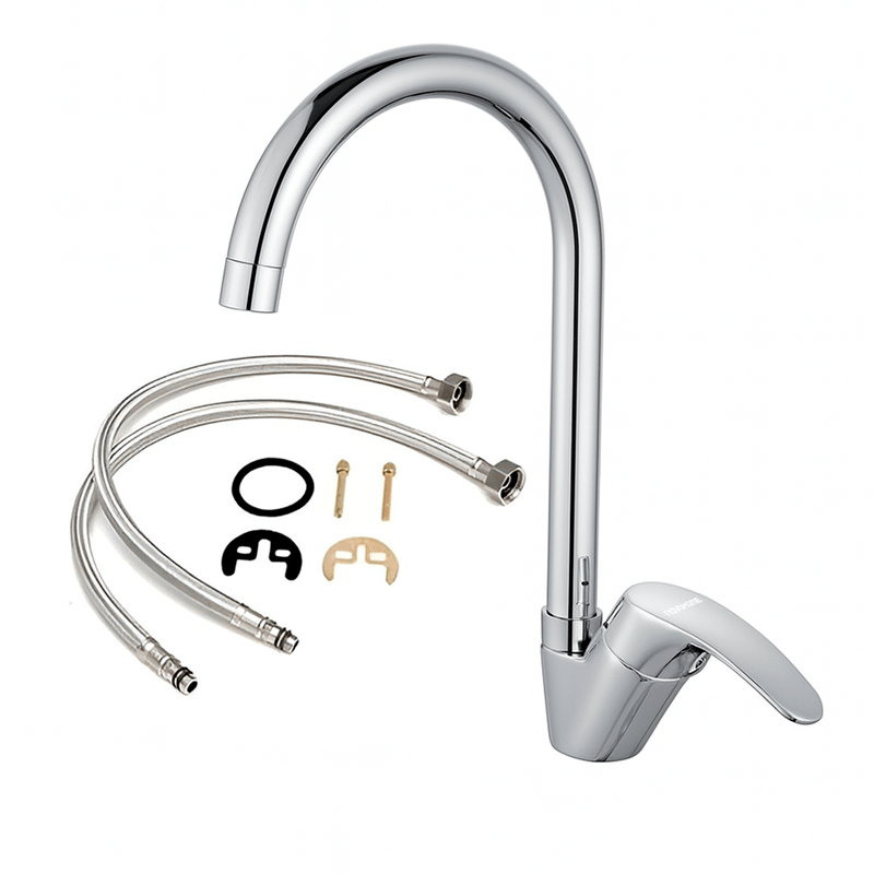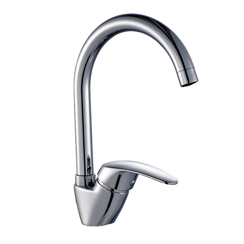 Aporta elegancia y funcionalidad a tu cocina con esta grifería monocomando de diseño contemporáneo en acabado cromo brillante. Su estructura curva de gran altura facilita el llenado de ollas y recipientes grandes, mientras que su boquilla fija de estilo caño alto asegura una cobertura amplia y cómoda del área de lavado.
