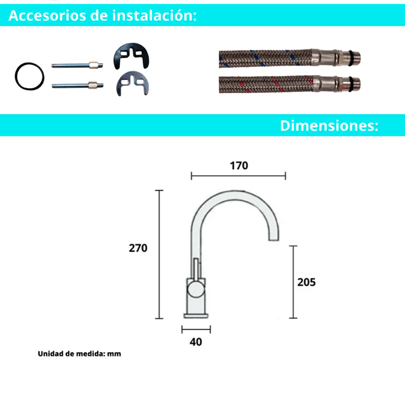 Cuerpo de acero inoxidable, cartucho cerámico 40 mm, con manguera tejida de 60 cm