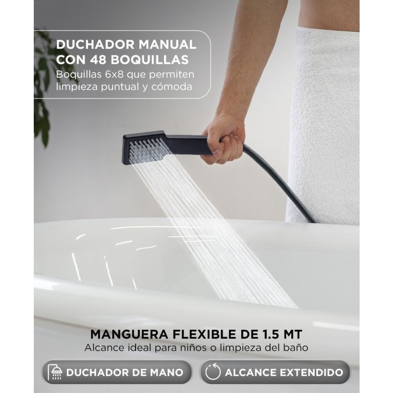 Duchador extraíble con 48 boquillas y manguera de 1.5 m para mayor comodidad.