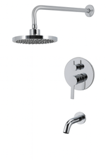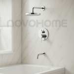 Este sofisticado set de grifería monocomando está diseñado para instalaciones de ducha con salida a tina, ofreciendo una solución completa con funcionalidad moderna, estética elegante y materiales de alta durabilidad. Su acabado otorga una apariencia pulida y contemporánea, ideal para baños de estilo minimalista o moderno.