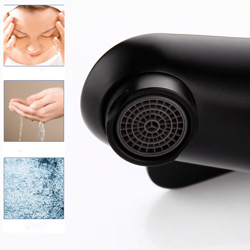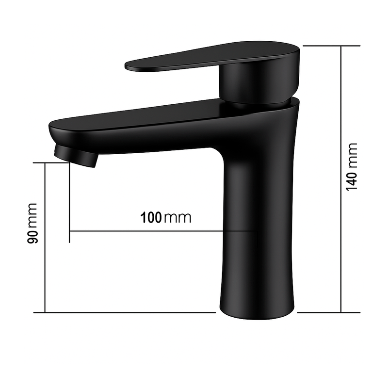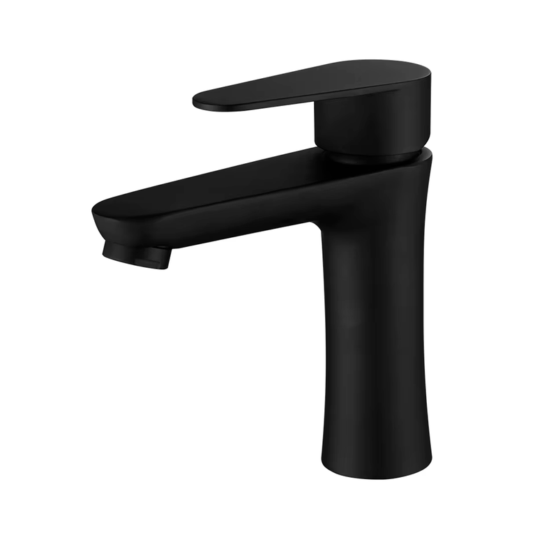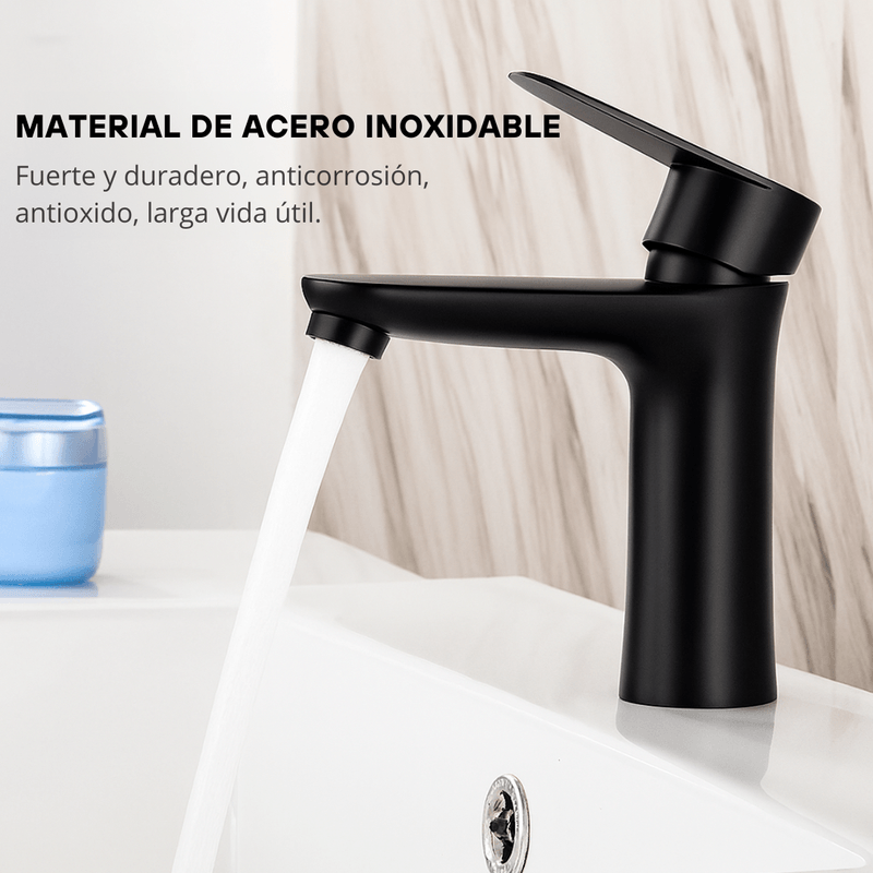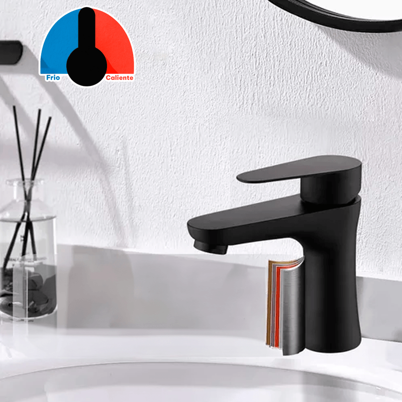 Grifería de diseño moderno y minimalista en acabado negro mate, ideal para lavatorios de baños contemporáneos. Su estilo elegante y robusto combina funcionalidad con una estética sofisticada.