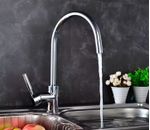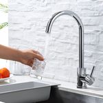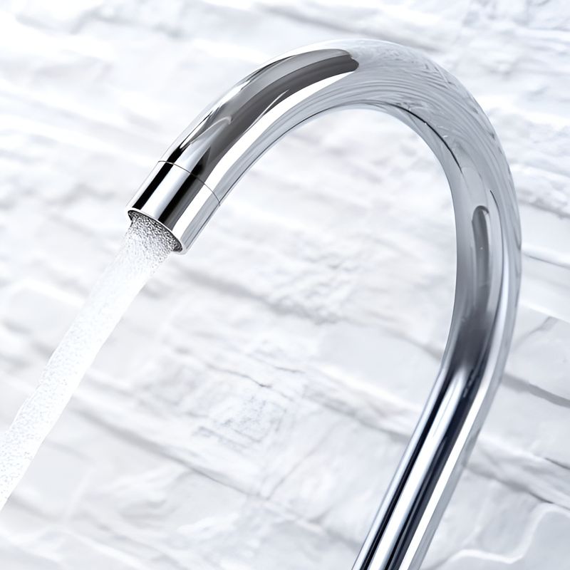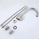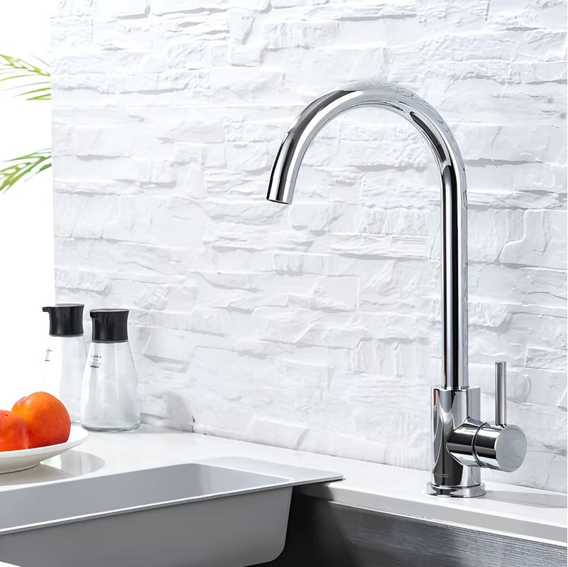 De acero inoxidable, con diseño curvo alto tipo cuello de cisne que permite mayor comodidad para el llenado de ollas o la limpieza de utensilios grandes.