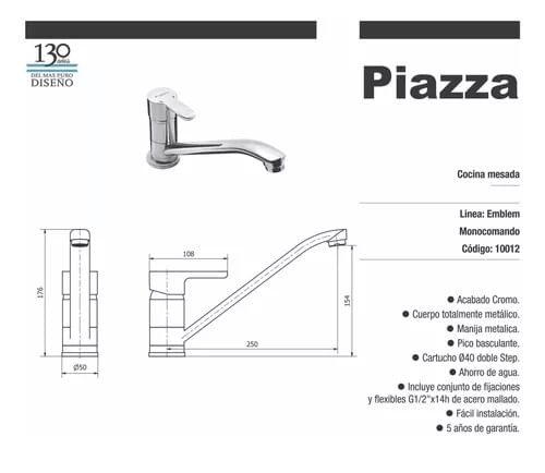 GRIFO COCINA MONOCOMANDO PIAZZA EMBLEM 10012 ACABADO CROMADO