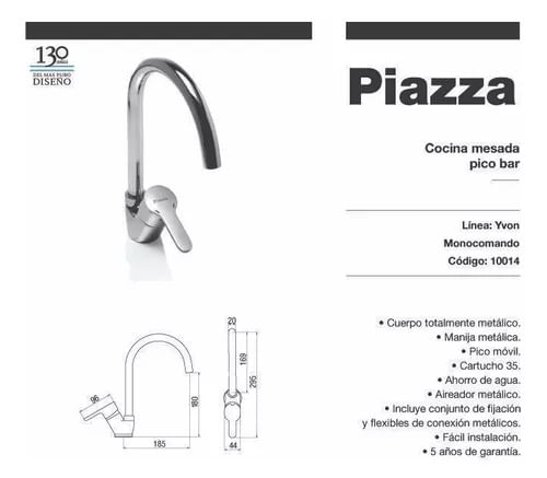 Sin dudas, la cocina es uno de los lugares más transitados de la casa y, por ello, es muy importante elegir la grifería que se adapte a las necesidades de uso. La marca Piazza ofrece un diseño cómodo y práctico que te permitirá regular la salida de agua cuando laves platos, cocines, etc.