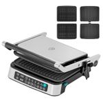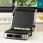 • Máxima versatilidad: Utilizala como una parrilla de panini para sándwiches perfectos o abrila completamente a 180 grados para una doble superficie de cocción, ideal para asar hamburguesas, bifes, pescado, pollo y vegetales.