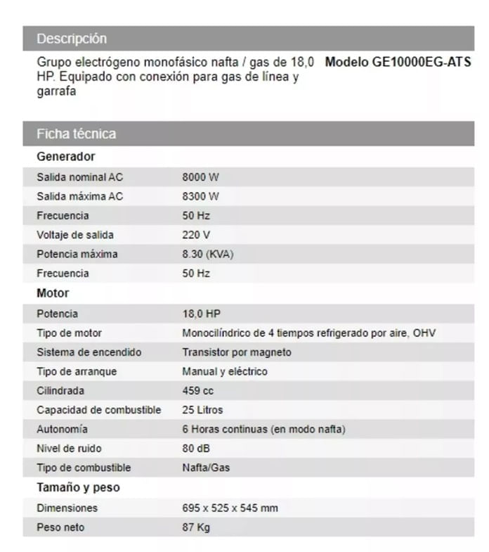 Autonomía: 6 Horas continuas (en modo nafta)