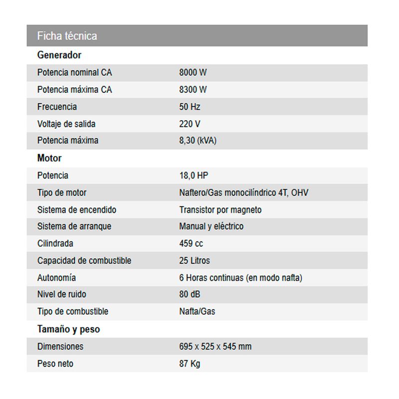 - Doble alimentación: Nafta/Gas para mayor flexibilidad y ahorro en combustible.
