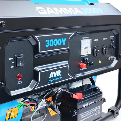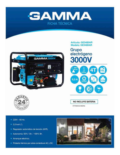 Arranque eléctrico. Regulador automático de tensión (AVR) Autonomía: 50% 13h. / 100% 8h Protector térmico por sobre corriente en AC y DC. Producto con diseño de avanzada, bajo nivel de ruido, alto rendimiento y sencillo funcionamiento. NO INCLUYE BATERIA.