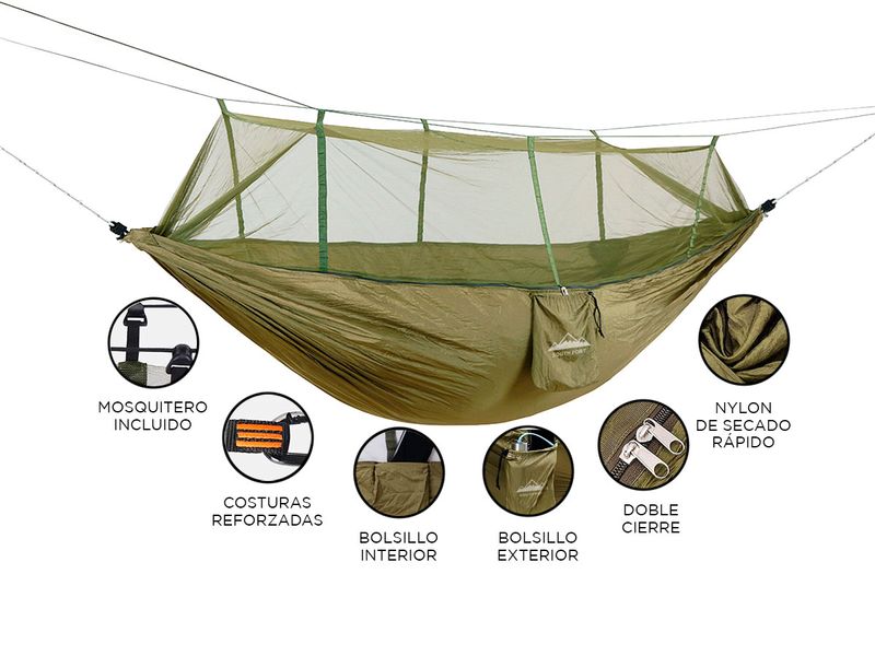 Bolso: viene con su bolso transportable que, colocada la hamaca, funciona como bolsillo para almacenar objetos