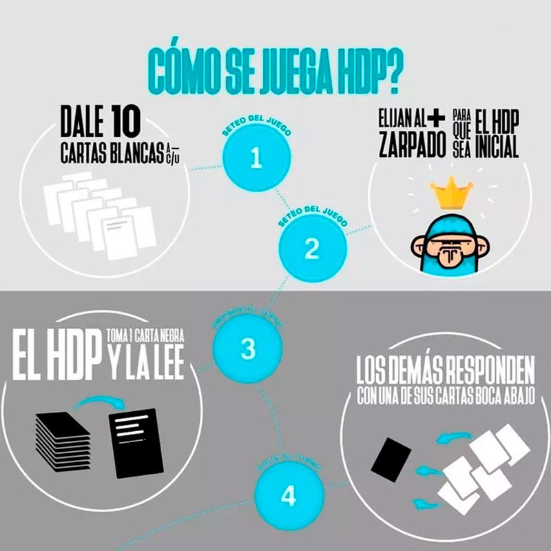 Un jugador (el HDP) lee una carta de pregunta (negra) y los demás responden con una de las cartas de su mano (blanca). La respuesta que le resulte más graciosa o zarpada al HDP, gana un punto para el que la jugó.