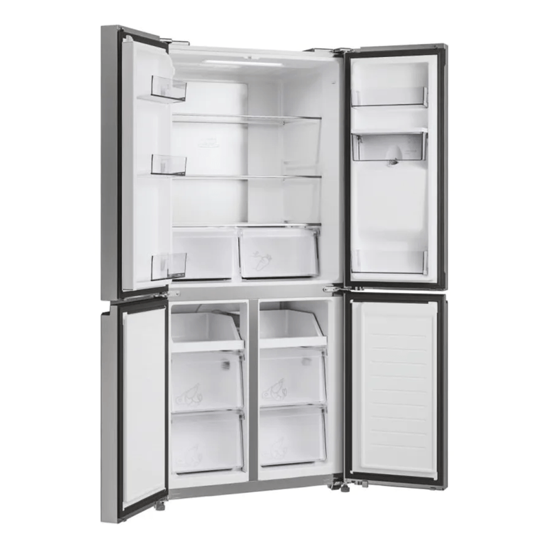 Su interior dispone de estantes de vidrio templado, iluminación LED y dispensador de agua en la puerta, además de amplios cajones para organizar alimentos frescos y congelados. El sistema de puertas múltiples permite abrir únicamente el sector necesario, reduciendo la pérdida de frío. Con eficiencia energética Clase E, es una opción moderna, funcional y elegante para cualquier cocina.