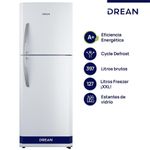 Esta heladera combina diseño moderno y funcionalidad con un frente blanco y manijas en color gris con detalles cromados que aportan un estilo sofisticado a cualquier cocina. Con una capacidad bruta de 397 litros y neta de 395 litros, ofrece amplio espacio para organizar y conservar alimentos. Está equipada con iluminación LED, que mejora la visibilidad en su interior y reduce el consumo energético. Incluye prácticos accesorios como una huevera y cubetera, además de anaqueles en la contrapuerta para una organización versátil y eficiente.CíclicaEl sistema de enfriamiento cíclico enfría directamente las paredes internas, formando una fina capa de escarcha en el freezer. Si bien requiere descongelación manual, este tipo de sistema es reconocido por su capacidad para mantener temperaturas estables de forma económica. Es una opción eficiente y sencilla, ideal para quienes buscan un equilibrio entre rendimiento y ahorro energético.Cycle DefrostLa tecnología Cycle Defrost asegura una distribución uniforme del frío en cada compartimento, manteniendo la humedad natural de los alimentos por más tiempo. Esto permite conservar frutas, verduras y productos frescos en óptimas condiciones, prolongando su vida útil. Este sistema destaca por su eficiencia, ya que combina un enfriamiento homogéneo con una tecnología de fácil mantenimiento.Máxima ResistenciaFabricada con materiales duraderos, esta heladera cuenta con estantes de vidrio templado en el refrigerador, que son resistentes al peso y fáciles de limpiar. En el freezer, el estante de alambrón ofrecen soporte robusto para todo tipo de alimentos congelados. Con una calificación energética A+ y el uso de refrigerante ecológico R600a, este modelo combina eficiencia, resistencia y un diseño pensado para el cuidado de tus alimentos y del medio ambiente.
