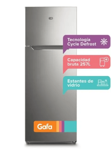 La Heladera Gafa 319L de caspacidad Bruta, Top Freezer y Puerta Reversible modelo (HGF311P) combina diseño moderno, organización inteligente y un funcionamiento confiable para acompañarte todos los días. Su interior amplio y bien distribuido facilita el acceso a cada alimento, mientras que la iluminación LED ofrece una visualización clara y eficiente. Sus estantes de vidrio templado aportan resistencia y un toque de elegancia, manteniendo el orden sin esfuerzo. Gracias al sistema de puerta reversible, podés adaptar la instalación al espacio disponible en tu cocina, optimizando la comodidad. Diseñada para brindar practicidad y confort, es una aliada perfecta para conservar tus alimentos de forma segura y mantener tu cocina siempre funcional.