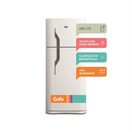 La heladera Gafa HGF358 AFP Plata, con 282L de capacidad, combina eficiencia energética A, tecnología Cycle Defrost y un gas ecológico, ofreciendo ahorro, cuidado ambiental y óptima conservación de alimentos.CíclicaUna heladera cíclica utiliza un sistema de enfriamiento directo que enfría las paredes internas, formando escarcha en el freezer. Es eficiente y sencilla, pero requiere descongelación manual. Su diseño es ideal para mantener temperaturas estables de forma económica.Estantes AjustablesAltura ajustable de los estantes de la heladera y del freezer para acomodar aalimentosde dif formas y tamaños.Gran CapacidadMás espacio para almacenar y organizar alimentos, bebidas y todo tipo de envases con mayor facilidad.