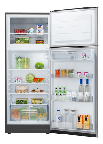Heladera con freezer cíclica. Eficiencia energética A. Color gris. Gas ecológico R600a. Capacidad bruta 362 litros. Capacidad neta 359 litros. Deshielo manual. Su tecnología Cycle Defrost permite mantener la humedad y textura de los alimentos por más tiempo. Dispenser de agua de 2 litros de capacidad. Sus estantes en refrigerador son de vidrio templado y regulables en altura para una mayor resistencia y versatilidad optimizando el espacio de almacenado. Sus estantes son de alambrón en freezer. Cuenta con anaqueles en contrapuerta para botellas y alimentos regulables en altura. Posee cajón para frutas y verduras. Control de temperatura con perilla interior. Luz interior LED. Cubeteras. Huevera. Apertura de puerta controlada.