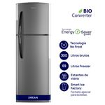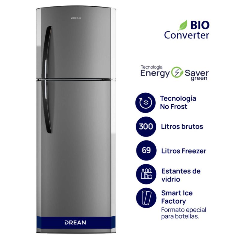 eladera con freezer no frost. Color steel. Capacidad bruta de 300 litros. Deshielo automático. Sistema Total Fresh Flow. Estantes de vidrio templado. Anaqueles en puertas. Smart factory ice. Cajón para delicados y crisper XXL para frutas y verduras. Tecnología Energy Saver Green. Luz LED. Heladera con freezer no frost. Eficiencia A. Color steel. Gas ecológico R600a. Sistema Total Fresh Flow para una mejor distribución del frío. Estantes de vidrio templado en refrigerador regulables en altura. Anaqueles en contrapuerta para botellas y alimentos en freezer y refrigerador. Smart factory ice. Cajón para delicados, crisper XXL para frutas y verduras. Tecnología Energy Saver Green. Control de temperatura interior. Sistema antihuellas. Apertura controlada. Luz LED.