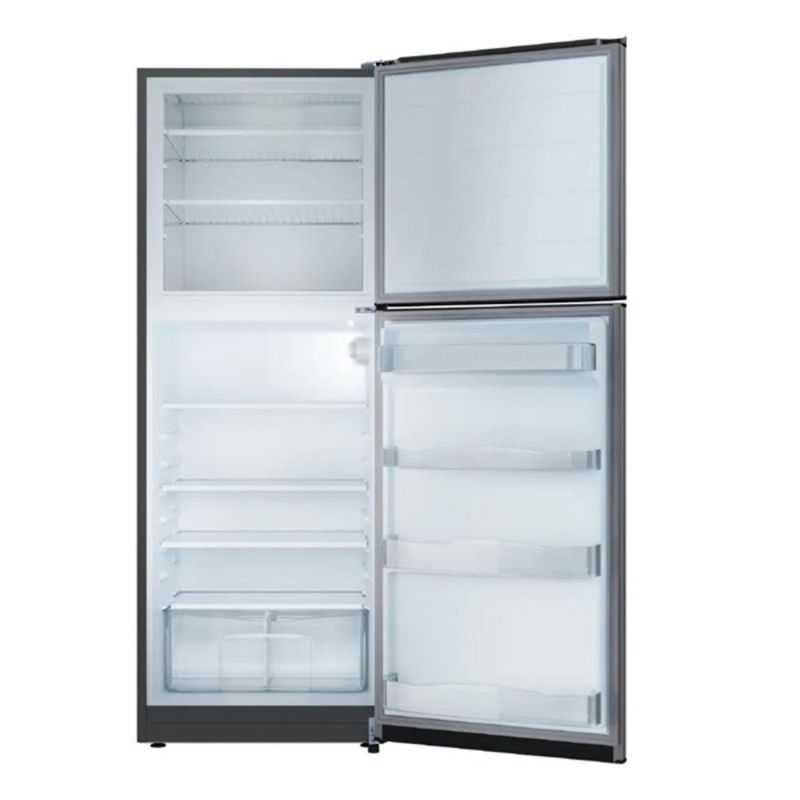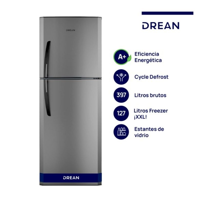 Heladera con freezer cíclica. Eficiencia energética A+. Color gris. Freezer XXL. Gas ecológico R600a. Capacidad bruta 397 litros. Capacidad neta 395 litros. Estantes de vidrio templado en refrigerador regulables en altura para una mayor resistencia. Estantes de alambrón en freezer. Anaqueles en contrapuerta para botellas y alimentos regulables en altura. Cajón para frutas y verduras. Apertura de puerta controlada. Control de temperatura con perilla interior. Tecnología Cycle Defrost