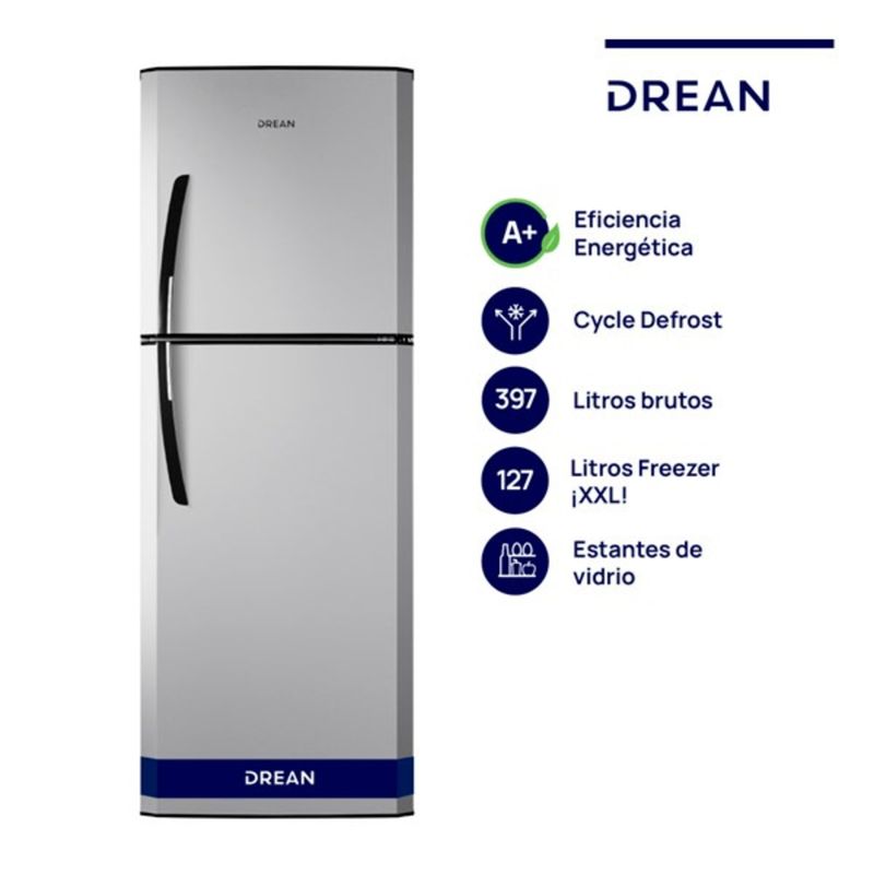 Heladera con freezer cíclica. Eficiencia energética A+. Color silver. Gas ecológico R600a. Capacidad bruta 397 litros. Capacidad neta 395 litros. Deshielo manual. Estantes regulables en altura de vidrio en refrigerador y alambrón en freezer. Anaqueles en contrapuerta para botellas y alimentos regulables en altura. Cajón para frutas y verduras. Cubeteras. Huevera. Apertura de puerta controlada. Control de temperatura con perilla interior. Luz LED. Patas regulables. Ruedas. Origen Argentina. Tecnología Cycle Defrost