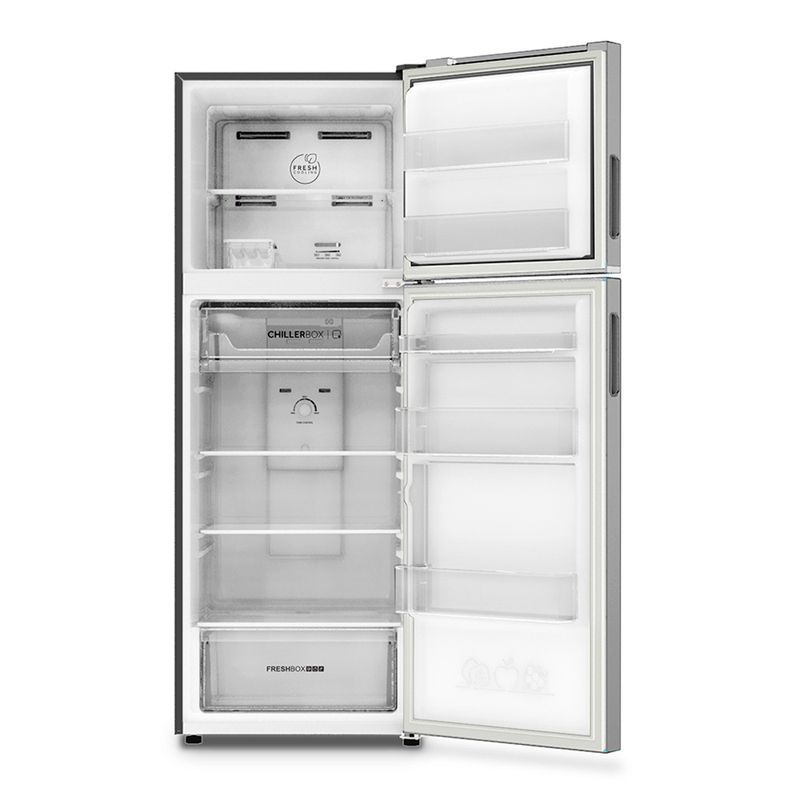 Heladera con freezer Twin Inverter No Frost. Eficiencia A+. Color inox. Capacidad de 342 litros. Deshielo automático. Sistema Fresh cooling. Estantes de vidrio templado. Anaqueles en puertas. Cajón XL para frutas y verduras. Control de temperatura independiente en freezer y refrigerador. Luz LED.