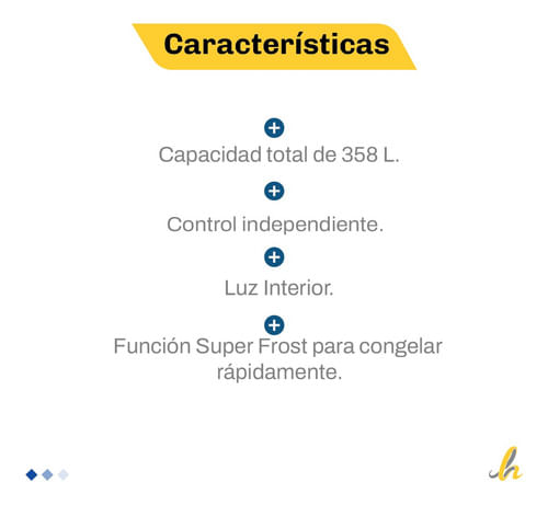- Capacidad total de 358 L para un almacenamiento eficiente.
