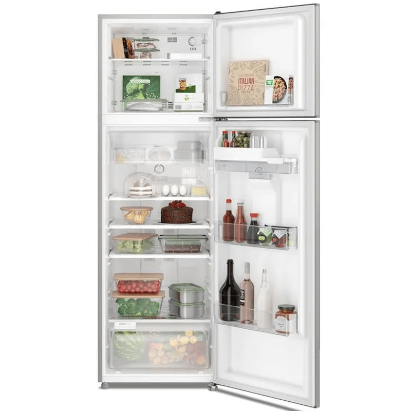 Diseño moderno y elegante en color plata, ideal para familias. Con gran capacidad de almacenamiento para alimentos y bebidas, y una organización eficiente que facilita el día a día.