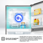 El dispenser de agua externo permite acceder a agua fría sin abrir la puerta, ahorrando energía y manteniendo constante la temperatura interna. La tecnología Inverter regula la velocidad del compresor según la demanda, asegurando un funcionamiento silencioso, eficiente y duradero. El flujo de aire múltiple distribuye el frío de forma equilibrada, mientras que el control electrónico de temperatura permite ajustes precisos. Además, cuenta con iluminación LED, patas ajustables y freezer de 4 estrellas apto para conservar alimentos a largo plazo.
