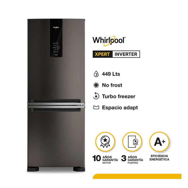 Heladera No Frost Whirlpool WRE57CE Xpert Inverter 449 Lt: Eficiencia A+, Freezer Inferior y Diseño Negro