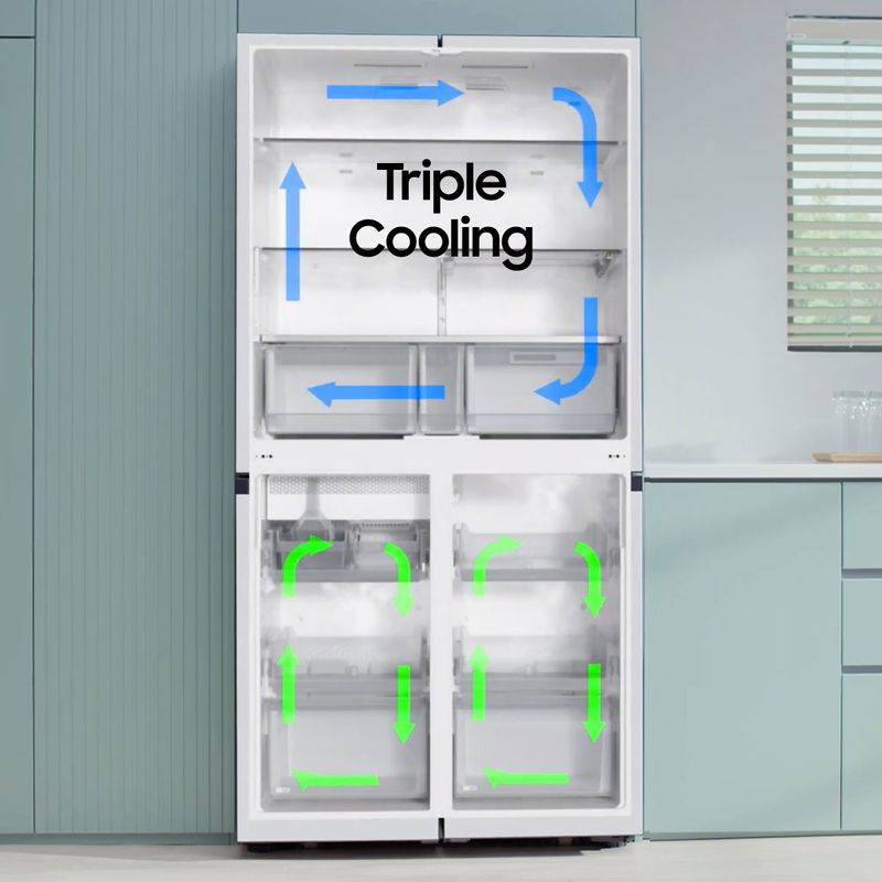 Mantiene los alimentos frescos durante mucho tiempo conservando su sabor y aroma. Triple Cooling suministra aire frío de forma independiente a los 3 compartimentos de la heladera y del freezer. Mantiene la temperatura y humedad óptimas en cada uno y asegura que su comida no se vea contaminada.