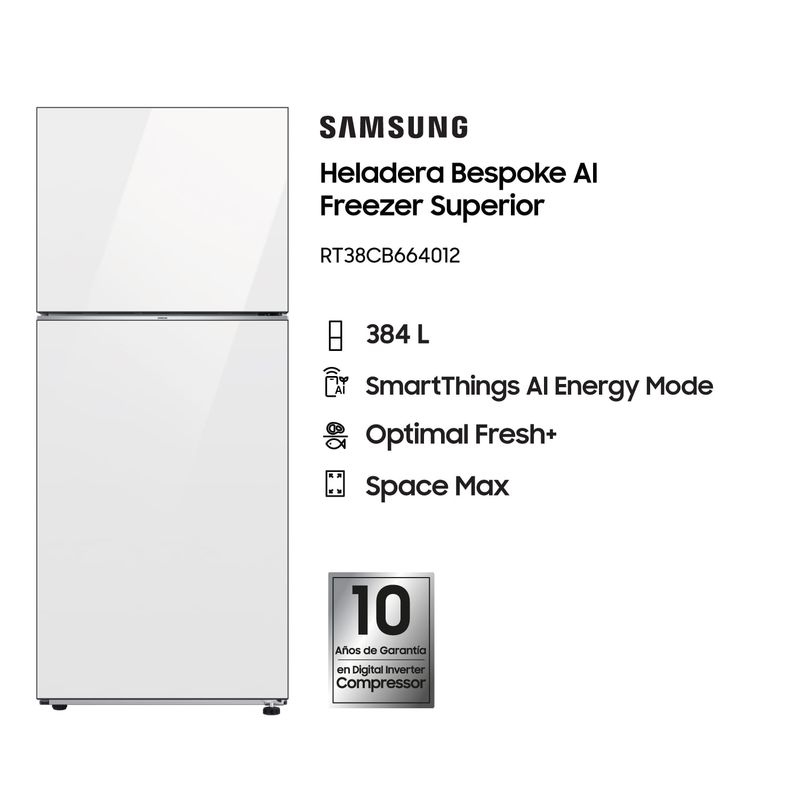 La heladera Samsung RT38CB664012B3 de 384 litros ofrece un diseño moderno en color Clean White con puerta Bespoke y la tecnología más avanzada para mantener tus alimentos frescos por más tiempo. Su capacidad total se distribuye en 97 litros para el freezer y 290 litros para el refrigerador, lo que garantiza un almacenamiento cómodo y organizado.