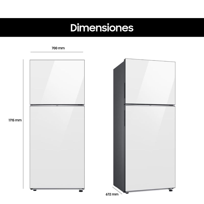 También es un electrodoméstico inteligente gracias a su conectividad WiFi y compatibilidad con la aplicación SmartThings, que permite controlar funciones desde el smartphone. Sus dimensiones son 700 mm de ancho, 1715 mm de alto y 672 mm de profundidad.