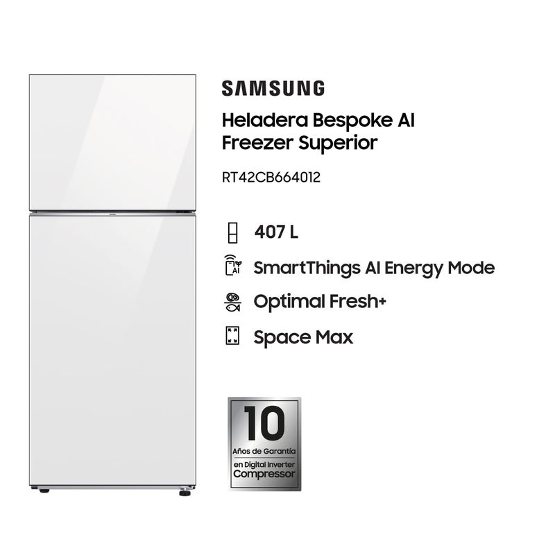 Forma parte de la línea Bespoke y cuenta con filtro Active Fresh, que ayuda a mantener un ambiente más higiénico dentro del refrigerador. Su display interno facilita el control de las funciones, y el compresor Digital Inverter asegura un rendimiento eficiente y duradero, respaldado por una garantía de 10 años, además de los 12 meses de garantía del producto.