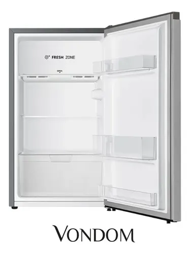 La heladera Vondom HEL82INOX tiene un diseño compacto y elegante que puede ubicarse en cualquier cocina, habitación u oficina. En su interior, cuenta con 1 estante desmontable para acomodar a gusto. Además, viene con un cajón especial para frutas y verduras y anaqueles para botellas. Por otro lado, dispone de congelador para guardar productos.