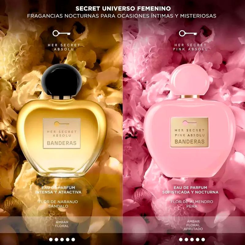 Her Secret Pink Absolu de Antonio Banderas es una fragancia femenina, elegante y seductora, diseñada para mujeres que buscan destacar con un aroma único. Su combinación de notas frutales de bergamota y pera, un corazón floral de peonía, rosa y flor de almendro, y una base cálida de vainilla, vetiver y ámbar, crea un perfume envolvente y sofisticado, ideal para la noche y ocasiones especiales.