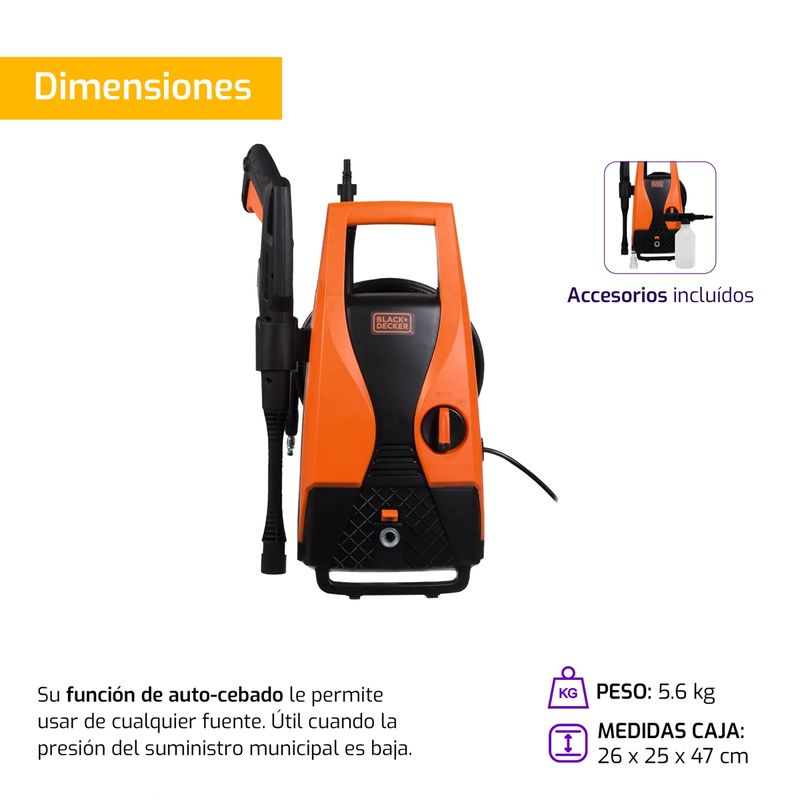 Esta potente y compacta hidrolavadora de alta potencia de BLACK+DECKER es todo lo que necesita para realizar las más difíciles tareas en el hogar. Su máxima presión de 1512psi (105 bar) hace de la limpieza de patios, muros, ventanas, muebles, bicicletas, motocicletas y carros tarea fácil y rápida. Su función de auto-cebado le permite usar de cualquier fuente: una cubeta, un lago o una alberca. También es útil cuando la presión del suministro municipal es baja. El lavador PW1450TD BLACK+DECKER ligero y portátil es fácil de guardar y de llevar, y le brinda gran potencia y conveniencia a un precio asequible.