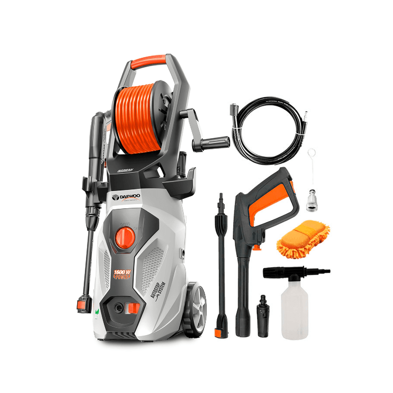 La hidrolavadora Daewoo DAX65-100 combina potencia y eficiencia con su motor de 1600 W, bomba metálica y sistema Auto-Stop que ahorra energía al detenerse cuando no se gatilla. Ofrece hasta 105 bar de presión y un caudal máximo de 426 l/h, garantizando limpieza profunda en menos tiempo. Compacta y fácil de transportar gracias a sus ruedas, mango y enrollador de manguera de 5 m, incluye pistola con gatillo, lanza ajustable, boquillas, dosificador de detergente, filtro, limpiador de boquilla, esponja y accesorios de transporte, siendo la aliada ideal para enfrentar la suciedad más rebelde con practicidad y durabilidad.