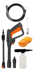- Incluye: Pistola, lanza, boquilla ajustable de 0° a 60°, manguera de alta presión de 5 m, botella de detergente, filtro de entrada, limpiador de boquilla y esponja de microfibra.