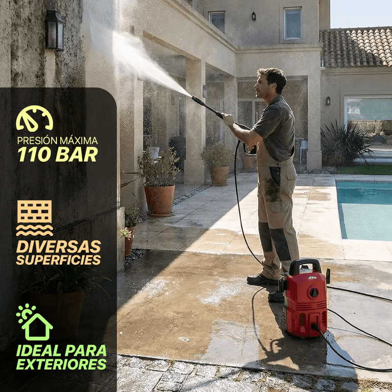 Incluye: Manguera de 3 metros, Kit deposito detergente, mango, pistola de plástico, lanza de plastico y adaptador de entrada.