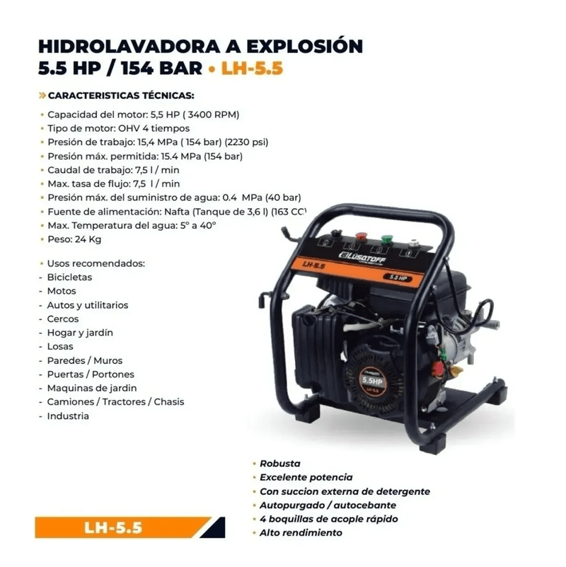 Hidrolavadora Explosión 154bar 5,5hp Manguera Lusqtoff Lh5.5