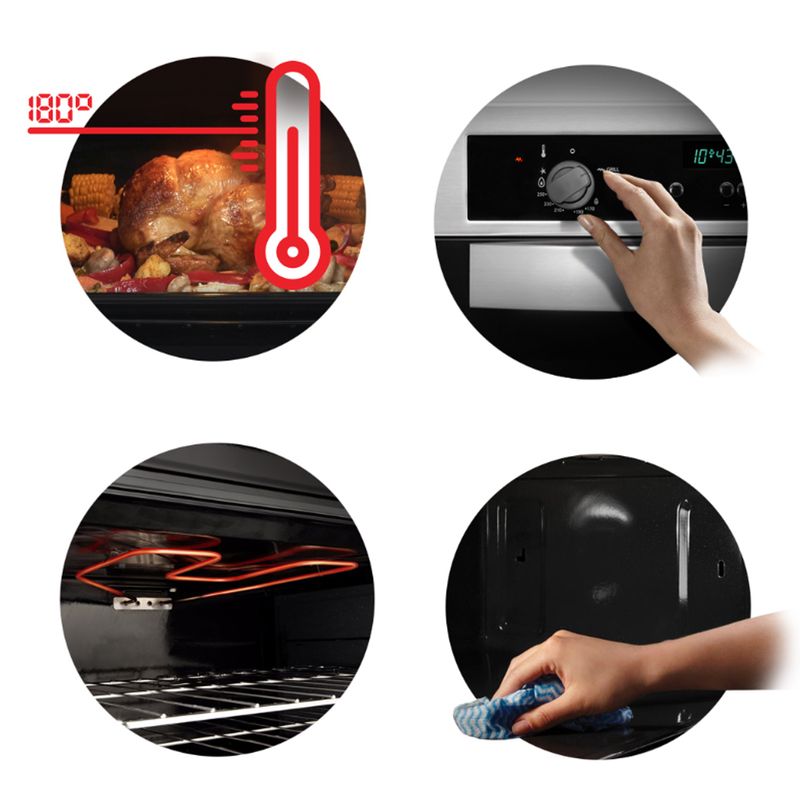 El termostato mantiene constante la temperatura del horno para lograr una cocción pareja y el timer anuncia la finalización del tiempo seleccionado.